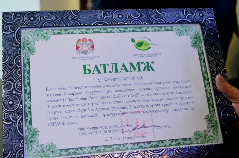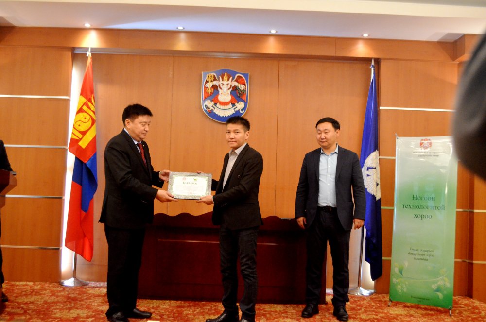 Нийслэлийн Засаг даргын тамгын газар, Нийслэлийн гэр хорооллын дэд бүтцийн газраас гэр хорооллын суурьшлын бүсэд агаар болон хөрсний бохирдлыг бууруулах, иргэдийн эрүүл аюулгүй орчинг бүрдүүлэхэд иргэдийн оролцоог нэмэгдүүлэхээр иргэдээс гарсан шинэ санал, санаачилгыг дэмжиж, дэвшилтэд техник технологийг нэвтрүүлэх зорилгоор “Ногоон технологитой хороо” төсөлд шалгарсан хороодод Нийслэлийн Засаг дарга бөгөөд Улаанбаатар хотын Захирагч С.Батболд, Нийслэлийн гэр хорооллын дэд бүтцийн газрын дарга М.Ганбаатар нар батламжийг нь гардуулан өглөө.